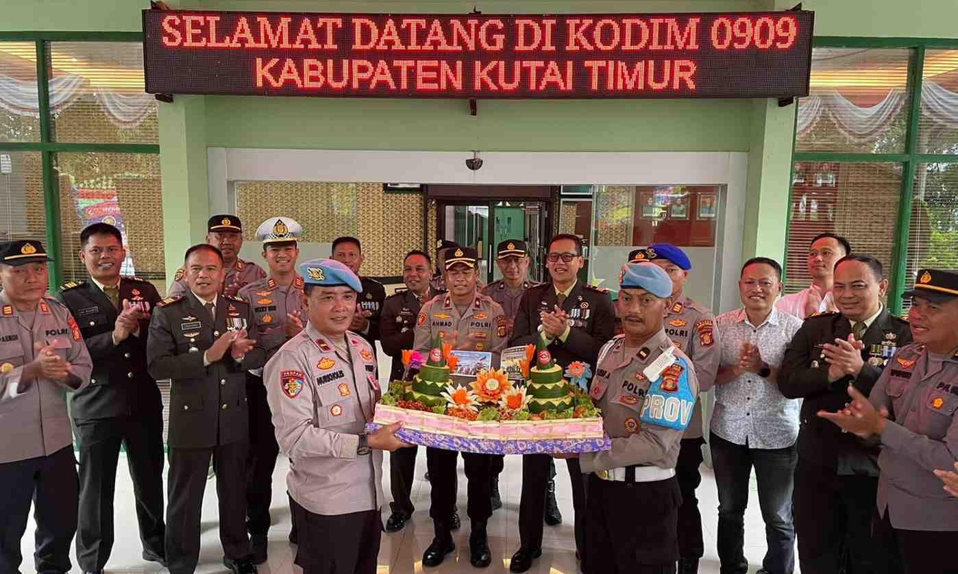Mengawali kunjungan, Polres Kutim menuju Kodim 0909/KTM. Setibanya di lokasi, Wakapolres Kutim menyerahkan secara simbolis nasi tumpeng kepada Danramil 0909-07, Kapten KAV. Hani Akhiyat, sebagai wujud apresiasi dan persaudaraan antar institusi penegak kedaulatan dan keamanan negara.