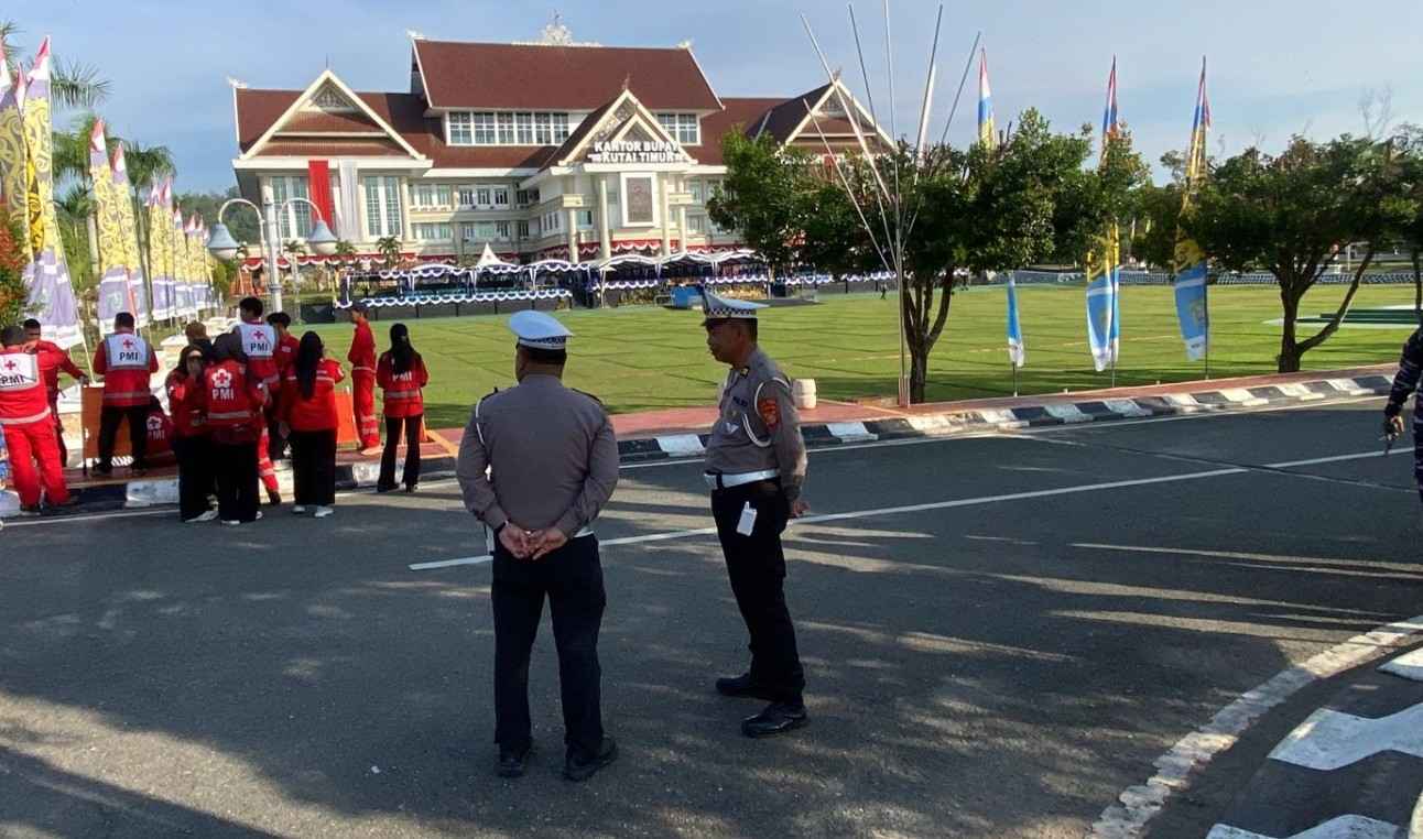 Sejumlah ruas jalan di sekitar Kantor Bupati Kutim, termasuk akses masuk dan keluar area perkantoran, dijaga dengan ketat. Personel juga membantu para tamu undangan dan peserta upacara, agar dapat melintas dengan tertib.