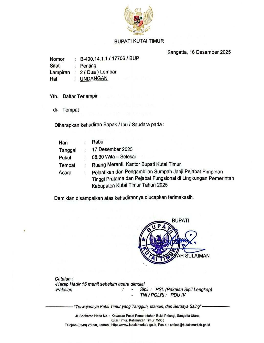 Berdasarkan undangan resmi yang dikeluarkan Bupati Kutim Ardiansyah Sulaiman, kegiatan tersebut dijadwalkan berlangsung pada Rabu, 17 Desember 2025, bertempat di Ruang Meranti, Kantor Bupati Kutim, mulai pukul 08.30 Wita hingga selesai.